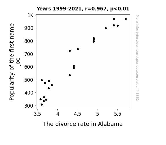 This means 93.5% of the change in the one variable (i.e., The divorce rate in Alabama) is predictable based on the change in the other (i.e., Popularity of the first name Joe) over the 23 years from 1999 through 2021.