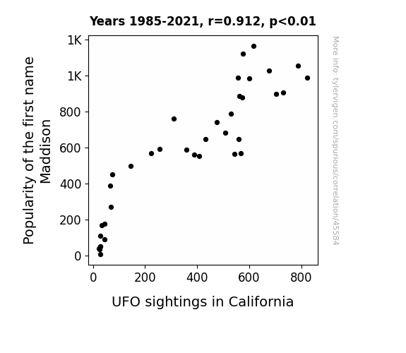 This means 83.2% of the change in the one variable (i.e., UFO sightings in California) is predictable based on the change in the other (i.e., Popularity of the first name Maddison) over the 37 years from 1985 through 2021.