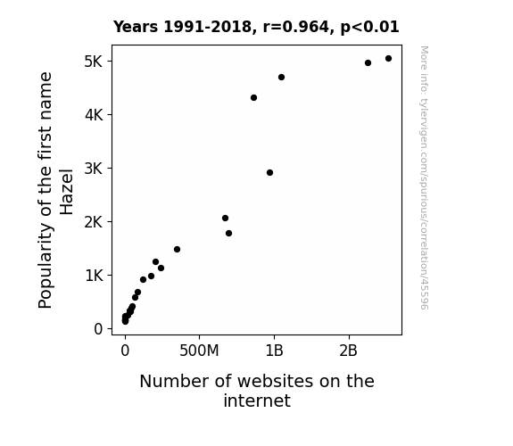 This means 92.9% of the change in the one variable (i.e., Number of websites on the internet) is predictable based on the change in the other (i.e., Popularity of the first name Hazel) over the 28 years from 1991 through 2018.