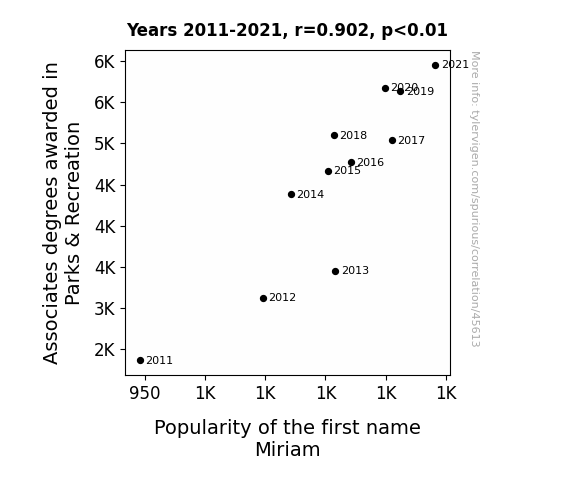 This means 81.4% of the change in the one variable (i.e., Popularity of the first name Miriam) is predictable based on the change in the other (i.e., Associates degrees awarded in Parks & Recreation) over the 11 years from 2011 through 2021.