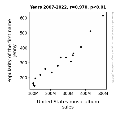 This means 94% of the change in the one variable (i.e., United States music album sales) is predictable based on the change in the other (i.e., Popularity of the first name Jenny) over the 16 years from 2007 through 2022.