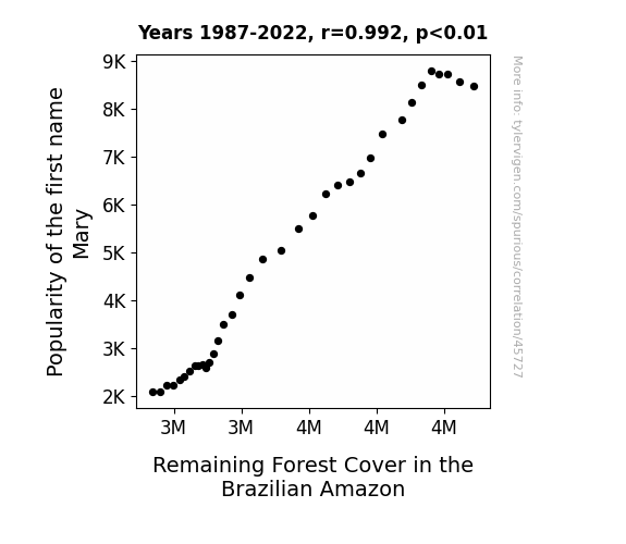 This means 98.5% of the change in the one variable (i.e., Remaining Forest Cover in the Brazilian Amazon) is predictable based on the change in the other (i.e., Popularity of the first name Mary) over the 36 years from 1987 through 2022.