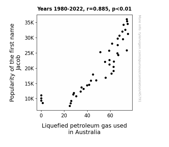 This means 78.3% of the change in the one variable (i.e., Liquefied petroleum gas used in Australia) is predictable based on the change in the other (i.e., Popularity of the first name Jacob) over the 43 years from 1980 through 2022.