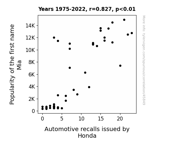 This means 68.4% of the change in the one variable (i.e., Automotive recalls issued by Honda) is predictable based on the change in the other (i.e., Popularity of the first name Mia) over the 48 years from 1975 through 2022.