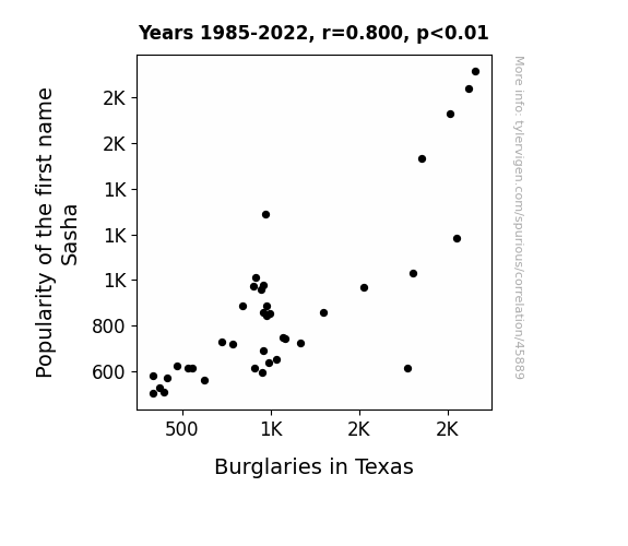 This means 64.1% of the change in the one variable (i.e., Burglaries in Texas) is predictable based on the change in the other (i.e., Popularity of the first name Sasha) over the 38 years from 1985 through 2022.