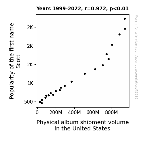 This means 94.4% of the change in the one variable (i.e., Physical album shipment volume in the United States) is predictable based on the change in the other (i.e., Popularity of the first name Scott) over the 24 years from 1999 through 2022.