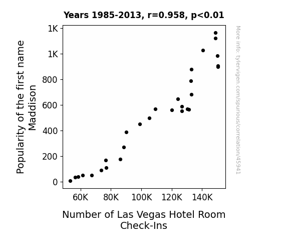 This means 91.9% of the change in the one variable (i.e., Number of Las Vegas Hotel Room Check-Ins) is predictable based on the change in the other (i.e., Popularity of the first name Maddison) over the 29 years from 1985 through 2013.