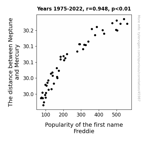 This means 89.9% of the change in the one variable (i.e., Popularity of the first name Freddie) is predictable based on the change in the other (i.e., The distance between Neptune and Mercury) over the 48 years from 1975 through 2022.