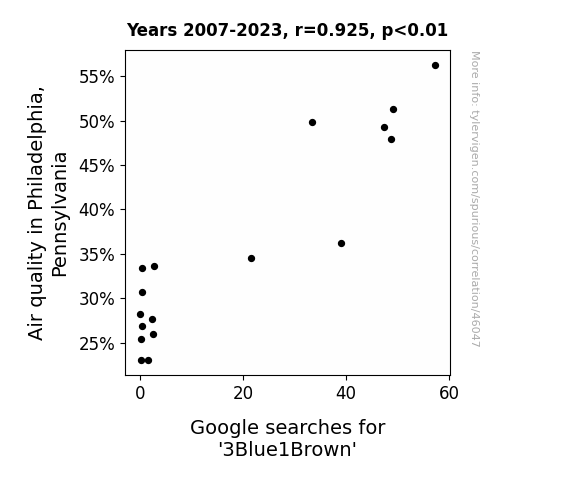 This means 85.6% of the change in the one variable (i.e., Google searches for '3Blue1Brown') is predictable based on the change in the other (i.e., Air quality in Philadelphia, Pennsylvania) over the 17 years from 2007 through 2023.
