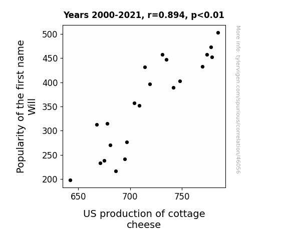 This means 80% of the change in the one variable (i.e., US production of cottage cheese) is predictable based on the change in the other (i.e., Popularity of the first name Will) over the 22 years from 2000 through 2021.