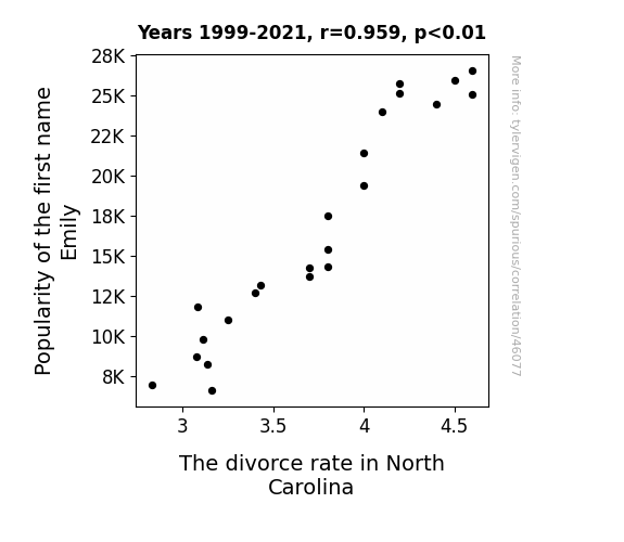 This means 92.1% of the change in the one variable (i.e., The divorce rate in North Carolina) is predictable based on the change in the other (i.e., Popularity of the first name Emily) over the 23 years from 1999 through 2021.