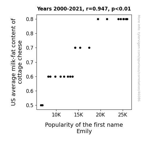 This means 89.7% of the change in the one variable (i.e., Popularity of the first name Emily) is predictable based on the change in the other (i.e., US average milk-fat content of cottage cheese) over the 22 years from 2000 through 2021.