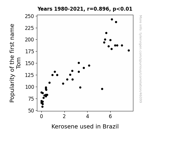 This means 80.3% of the change in the one variable (i.e., Kerosene used in Brazil) is predictable based on the change in the other (i.e., Popularity of the first name Tom) over the 42 years from 1980 through 2021.