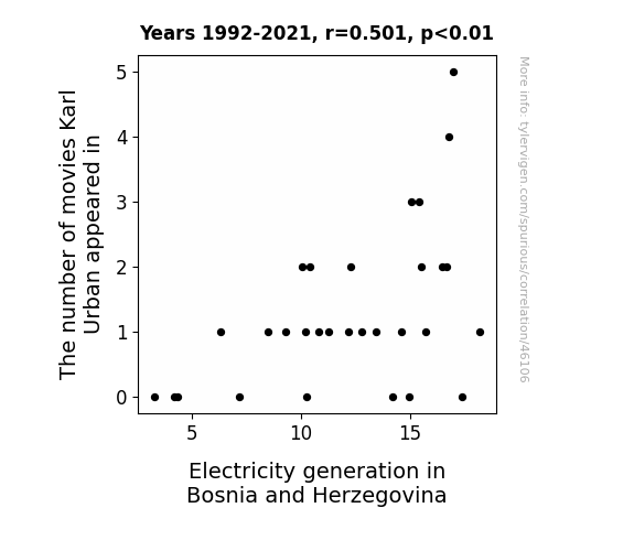 This means 25.1% of the change in the one variable (i.e., Electricity generation in Bosnia and Herzegovina) is predictable based on the change in the other (i.e., The number of movies Karl Urban appeared in) over the 30 years from 1992 through 2021.