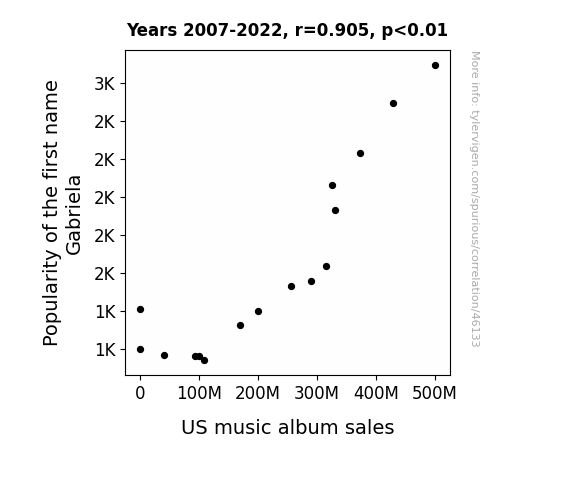 This means 81.9% of the change in the one variable (i.e., US music album sales) is predictable based on the change in the other (i.e., Popularity of the first name Gabriela) over the 16 years from 2007 through 2022.