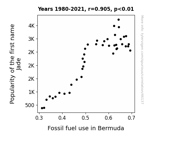 This means 81.9% of the change in the one variable (i.e., Fossil fuel use in Bermuda) is predictable based on the change in the other (i.e., Popularity of the first name Jade) over the 42 years from 1980 through 2021.