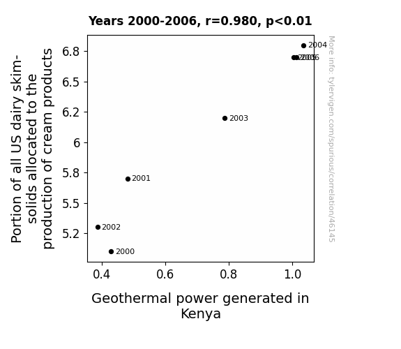This means 96.1% of the change in the one variable (i.e., Geothermal power generated in Kenya) is predictable based on the change in the other (i.e., Portion of all US dairy skim-solids allocated to the production of cream products) over the 7 years from 2000 through 2006.
