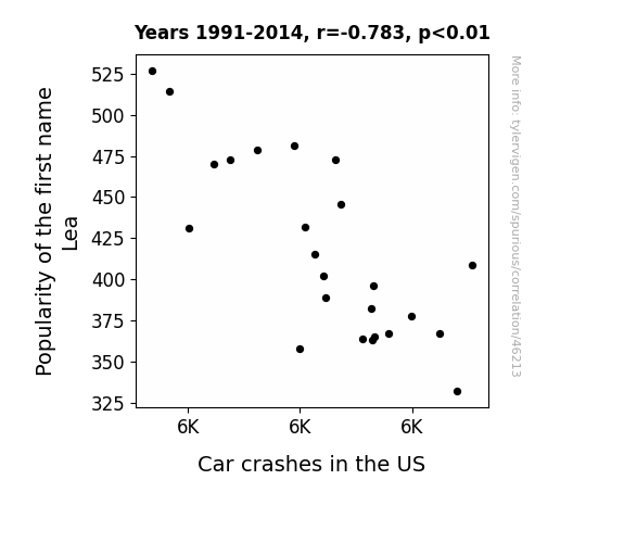This means 61.3% of the change in the one variable (i.e., Car crashes in the US) is predictable based on the change in the other (i.e., Popularity of the first name Lea) over the 24 years from 1991 through 2014.