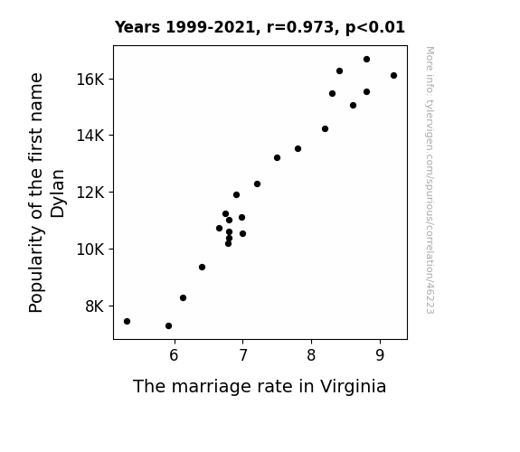 This means 94.7% of the change in the one variable (i.e., The marriage rate in Virginia) is predictable based on the change in the other (i.e., Popularity of the first name Dylan) over the 23 years from 1999 through 2021.
