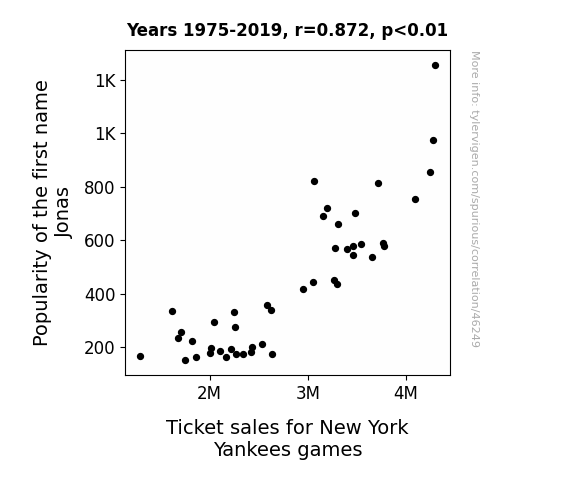 This means 76% of the change in the one variable (i.e., Ticket sales for New York Yankees games) is predictable based on the change in the other (i.e., Popularity of the first name Jonas) over the 45 years from 1975 through 2019.