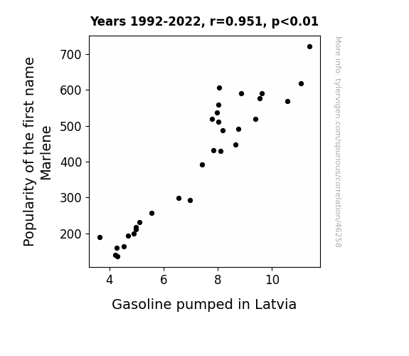 This means 90.4% of the change in the one variable (i.e., Gasoline pumped in Latvia) is predictable based on the change in the other (i.e., Popularity of the first name Marlene) over the 31 years from 1992 through 2022.