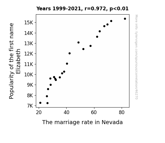 This means 94.5% of the change in the one variable (i.e., The marriage rate in Nevada) is predictable based on the change in the other (i.e., Popularity of the first name Elizabeth) over the 23 years from 1999 through 2021.