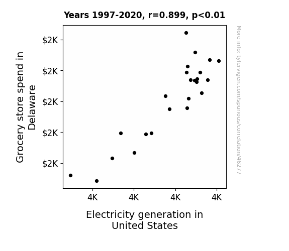 This means 80.9% of the change in the one variable (i.e., Electricity generation in United States) is predictable based on the change in the other (i.e., Grocery store spend in Delaware) over the 24 years from 1997 through 2020.