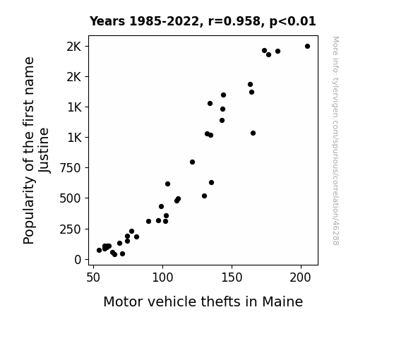 This means 91.8% of the change in the one variable (i.e., Motor vehicle thefts in Maine) is predictable based on the change in the other (i.e., Popularity of the first name Justine) over the 38 years from 1985 through 2022.