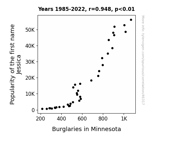This means 89.8% of the change in the one variable (i.e., Burglaries in Minnesota) is predictable based on the change in the other (i.e., Popularity of the first name Jessica) over the 38 years from 1985 through 2022.