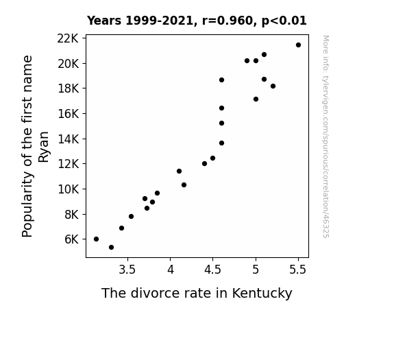 This means 92.1% of the change in the one variable (i.e., The divorce rate in Kentucky) is predictable based on the change in the other (i.e., Popularity of the first name Ryan) over the 23 years from 1999 through 2021.