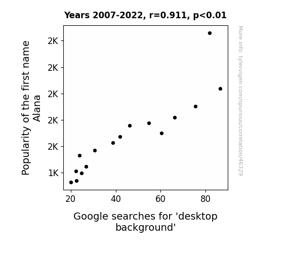 This means 82.9% of the change in the one variable (i.e., Google searches for 'desktop background') is predictable based on the change in the other (i.e., Popularity of the first name Alana) over the 16 years from 2007 through 2022.