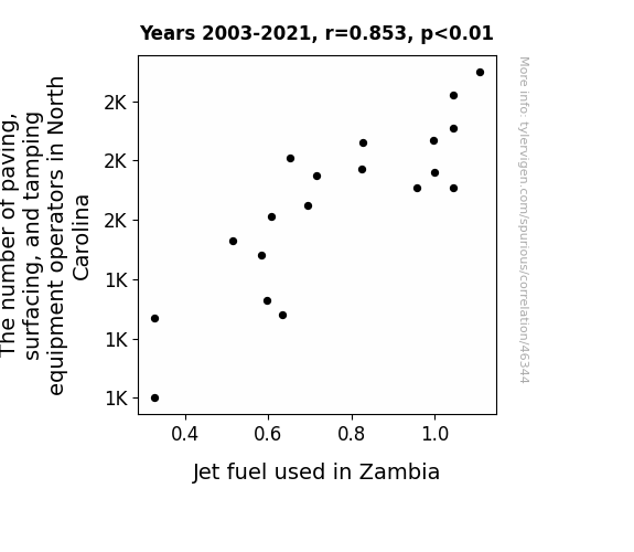 This means 72.8% of the change in the one variable (i.e., Jet fuel used in Zambia) is predictable based on the change in the other (i.e., The number of paving, surfacing, and tamping equipment operators in North Carolina) over the 19 years from 2003 through 2021.