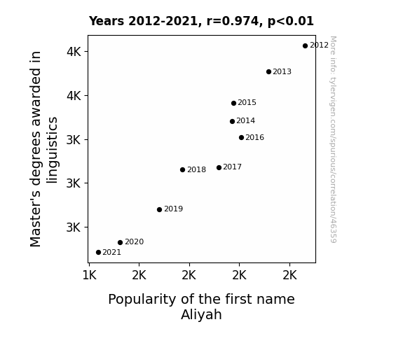 This means 94.8% of the change in the one variable (i.e., Popularity of the first name Aliyah) is predictable based on the change in the other (i.e., Master's degrees awarded in linguistics) over the 10 years from 2012 through 2021.