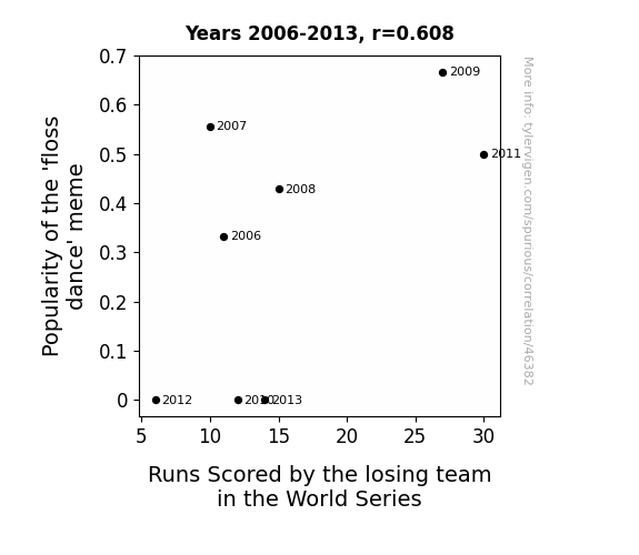 This means 36.9% of the change in the one variable (i.e., Runs Scored by the losing team in the World Series) is predictable based on the change in the other (i.e., Popularity of the 'floss dance' meme) over the 8 years from 2006 through 2013.