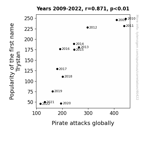 This means 75.9% of the change in the one variable (i.e., Pirate attacks globally) is predictable based on the change in the other (i.e., Popularity of the first name Trystan) over the 14 years from 2009 through 2022.