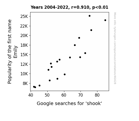 This means 82.8% of the change in the one variable (i.e., Google searches for 'shook') is predictable based on the change in the other (i.e., Popularity of the first name Emily) over the 19 years from 2004 through 2022.