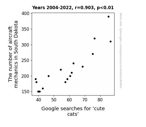 This means 81.5% of the change in the one variable (i.e., Google searches for 'cute cats') is predictable based on the change in the other (i.e., The number of aircraft mechanics in South Dakota) over the 19 years from 2004 through 2022.