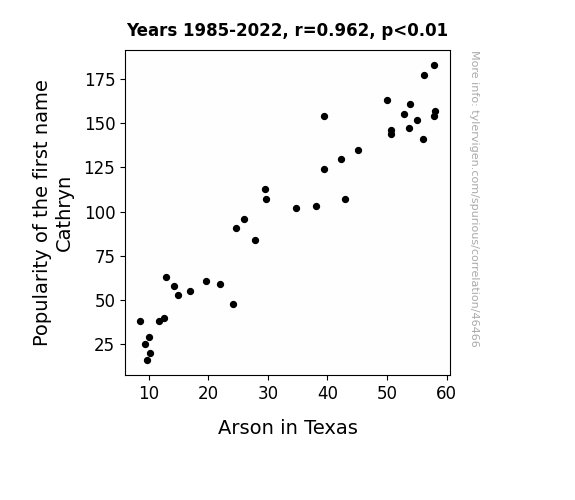 This means 92.6% of the change in the one variable (i.e., Arson in Texas) is predictable based on the change in the other (i.e., Popularity of the first name Cathryn) over the 38 years from 1985 through 2022.