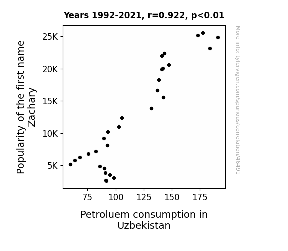 This means 85% of the change in the one variable (i.e., Petroluem consumption in Uzbekistan) is predictable based on the change in the other (i.e., Popularity of the first name Zachary) over the 30 years from 1992 through 2021.
