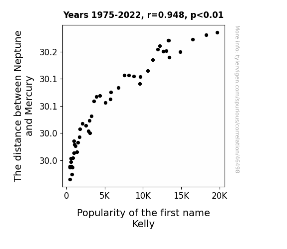This means 89.9% of the change in the one variable (i.e., Popularity of the first name Kelly) is predictable based on the change in the other (i.e., The distance between Neptune and Mercury) over the 48 years from 1975 through 2022.