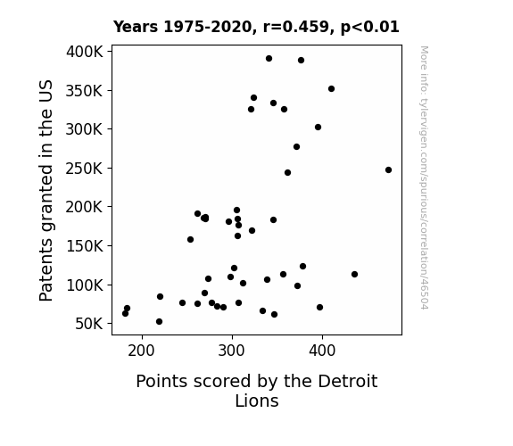 This means 21% of the change in the one variable (i.e., Points scored by the Detroit Lions) is predictable based on the change in the other (i.e., Patents granted in the US) over the 46 years from 1975 through 2020.