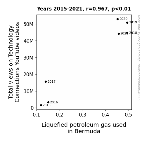 This means 93.5% of the change in the one variable (i.e., Liquefied petroleum gas used in Bermuda) is predictable based on the change in the other (i.e., Total views on Technology Connections YouTube videos) over the 7 years from 2015 through 2021.