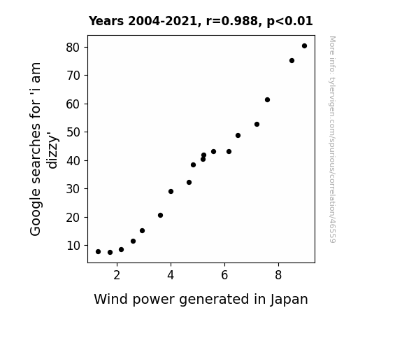 This means 97.7% of the change in the one variable (i.e., Wind power generated in Japan) is predictable based on the change in the other (i.e., Google searches for 'i am dizzy') over the 18 years from 2004 through 2021.