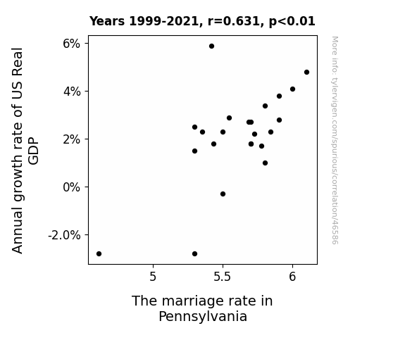 This means 39.8% of the change in the one variable (i.e., The marriage rate in Pennsylvania) is predictable based on the change in the other (i.e., Annual growth rate of US Real GDP) over the 23 years from 1999 through 2021.