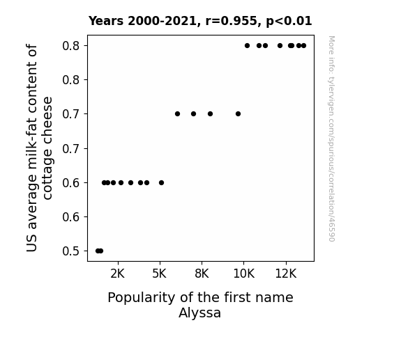 This means 91.2% of the change in the one variable (i.e., Popularity of the first name Alyssa) is predictable based on the change in the other (i.e., US average milk-fat content of cottage cheese) over the 22 years from 2000 through 2021.