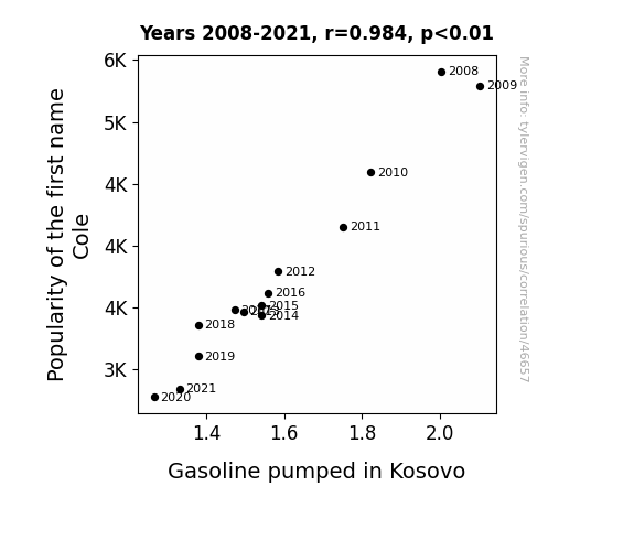 This means 96.8% of the change in the one variable (i.e., Gasoline pumped in Kosovo) is predictable based on the change in the other (i.e., Popularity of the first name Cole) over the 14 years from 2008 through 2021.