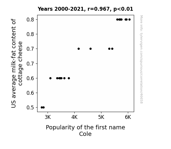 This means 93.4% of the change in the one variable (i.e., Popularity of the first name Cole) is predictable based on the change in the other (i.e., US average milk-fat content of cottage cheese) over the 22 years from 2000 through 2021.