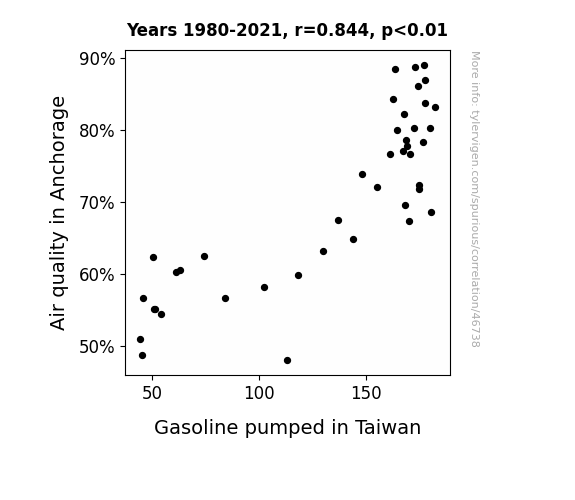 This means 71.2% of the change in the one variable (i.e., Gasoline pumped in Taiwan) is predictable based on the change in the other (i.e., Air quality in Anchorage) over the 42 years from 1980 through 2021.
