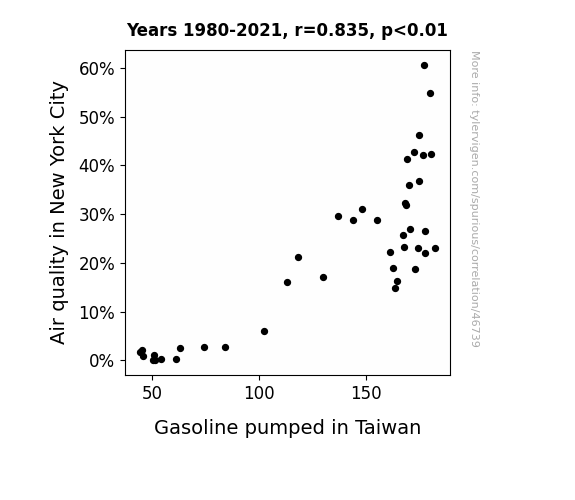 This means 69.6% of the change in the one variable (i.e., Gasoline pumped in Taiwan) is predictable based on the change in the other (i.e., Air quality in New York City) over the 42 years from 1980 through 2021.