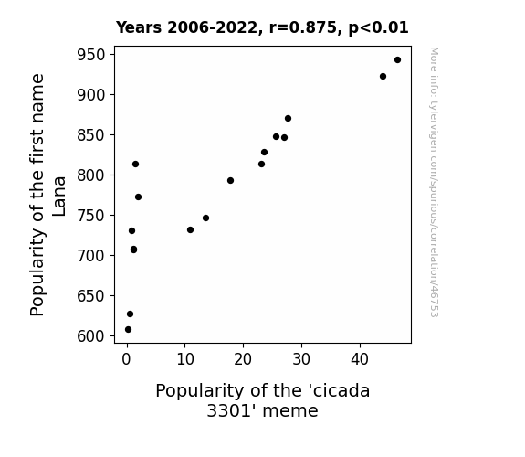 This means 76.6% of the change in the one variable (i.e., Popularity of the 'cicada 3301' meme) is predictable based on the change in the other (i.e., Popularity of the first name Lana) over the 17 years from 2006 through 2022.